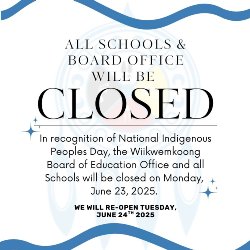 In recognition of National Indigenous Peoples Day, the Wiikwemkoong Board of Education Office and ✨ALL SCHOOLS✨ will be closed on Monday, June 23, 2025.